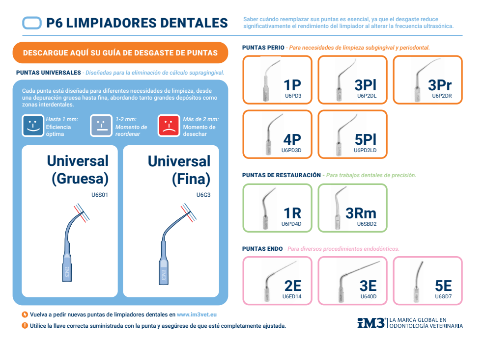 iM3 ofrece de forma gratuita una Guía de Desgaste de Puntas Piezo P6, que ayuda a identificar una punta desgastada que necesita ser reemplazada. Puede descargarse e imprimirse a continuación.